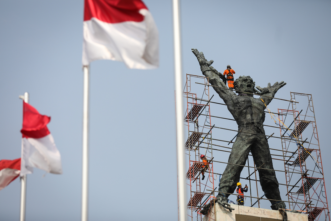 Petugas Pusat Konservasi Cagar Budaya Dinas Kebudayaan (Disbud) DKI Jakarta melakukan konservasi Monumen Pembebasan Irian Barat di Taman Lapangan Banteng, Sawah Besar, Jakarta Pusat, Jumat (27/9). Pelaksanaan konservasi ini merupakan program tahunan Disbud DKI Jakarta yang berkomitmen untuk menjaga kelestarian monumen bersejarah di Jakarta.