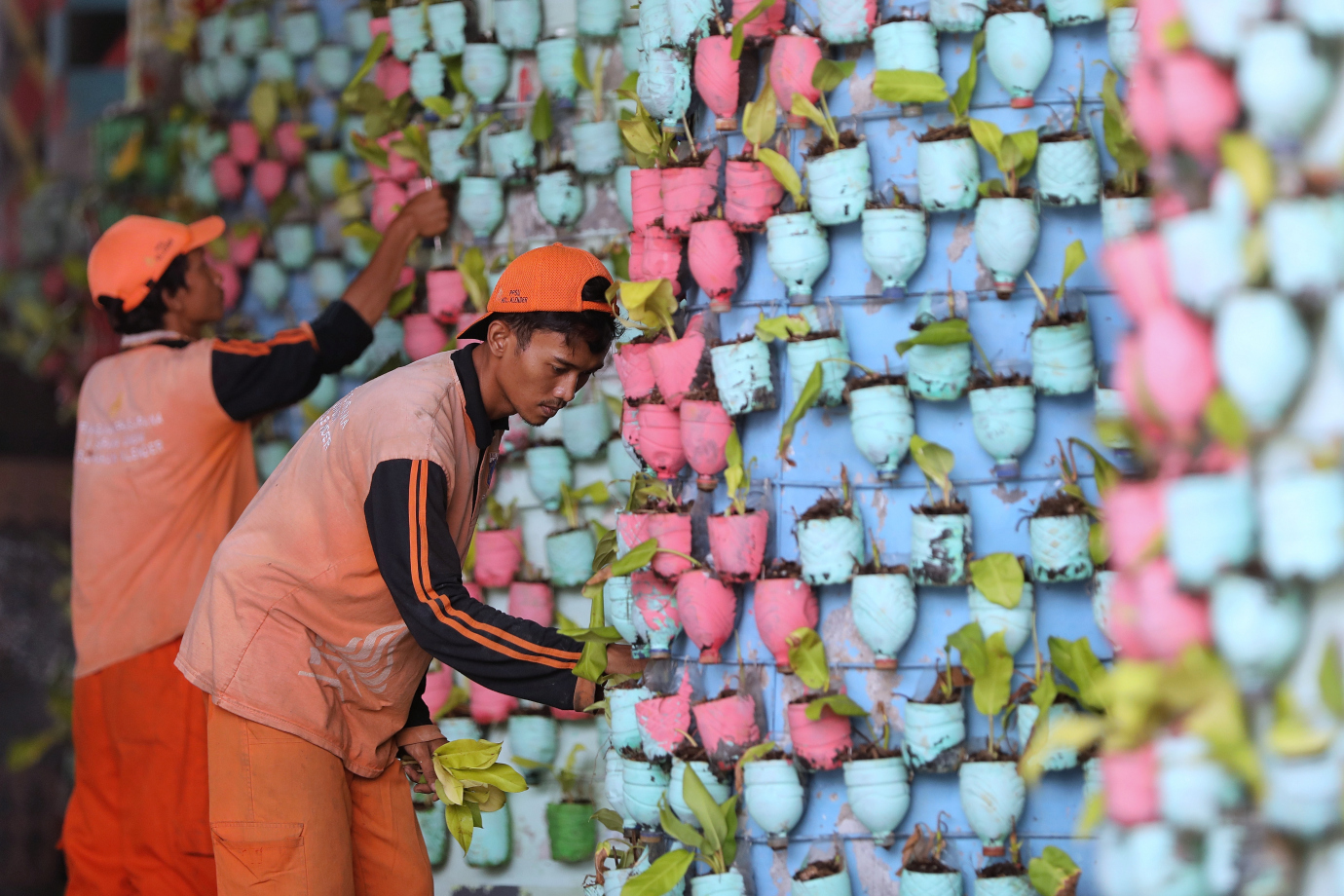 Sejumlah petugas PPSU Kelurahan Klender melakukan penataan ulang vertikal garden di kolong flyover Klender, Jalan I Gusti Ngurah Rai, Duren Sawit, Jakarta Timur, Kamis (26/9). Penataan berupa penanaman ulang tanaman hias sebanyak 1.400 pot.