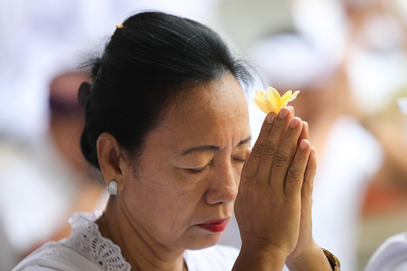 Umat Hindu mengikuti persembahyangan Hari Raya Galungan di Pura Aditya Jaya, Rawamangun, Pulo Gadung, Jakarta Timur, Rabu (25/9). Hari Raya Galungan merupakan simbol perayaan kemenangan kebaikan (dharma) melawan kejahatan (adharma) yang diperingati umat Hindu setiap 210 hari sekali.