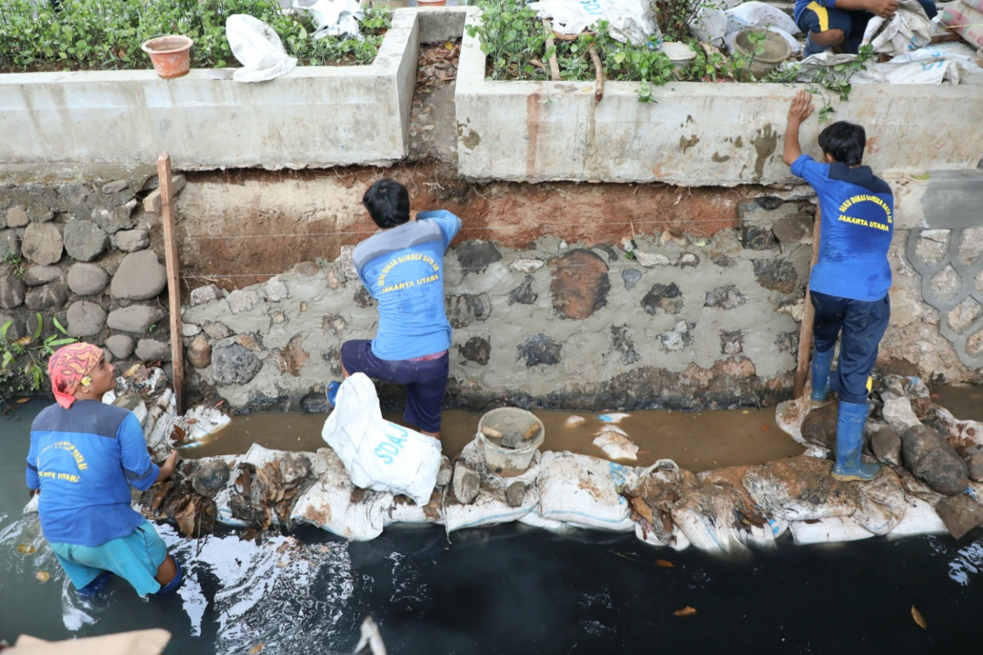 Delapan petugas Satuan Pelaksana Sumber Daya Air (Satpel SDA) Kecamatan Kelapa Gading melakukan perbaikan turap saluran PHB Kelapa Cengkir di Jalan Kelapa Cengkir Raya, Kelapa Gading Timur, Jakarta Utara, Rabu (25/9). Perbaikan turap saluran yang memiliki panjang 15 meter dan lebar 2,7 meter ini rusak karena terdorong akar sehingga harus segera dilakukan perbaikan.