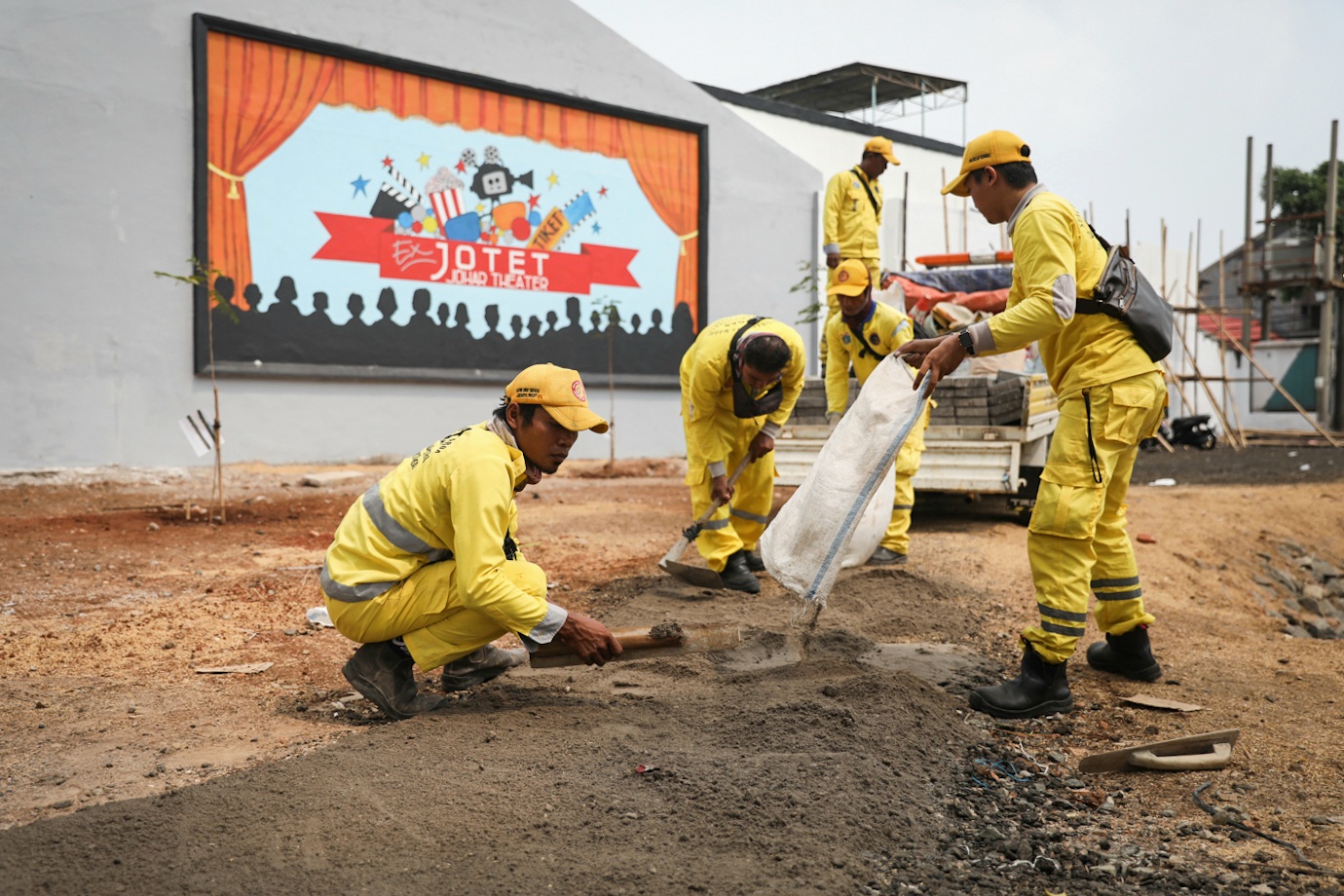 Sejumlah petugas gabungan dari Dinas Bina Marga dan Dinas Pertamanan dan Hutan Kota DKI Jakarta mengerjakan penataan kawasan eks Johar Theater di Jalan Kramat Jaya Baru, Johar Baru, Jakarta Pusat, Senin (23/9). Penataan lahan seluas sekitar 968 meter persegi menjadi taman atau ruang terbuka hijau (RTH) itu ditargetkan rampung pada Desember 2024.
