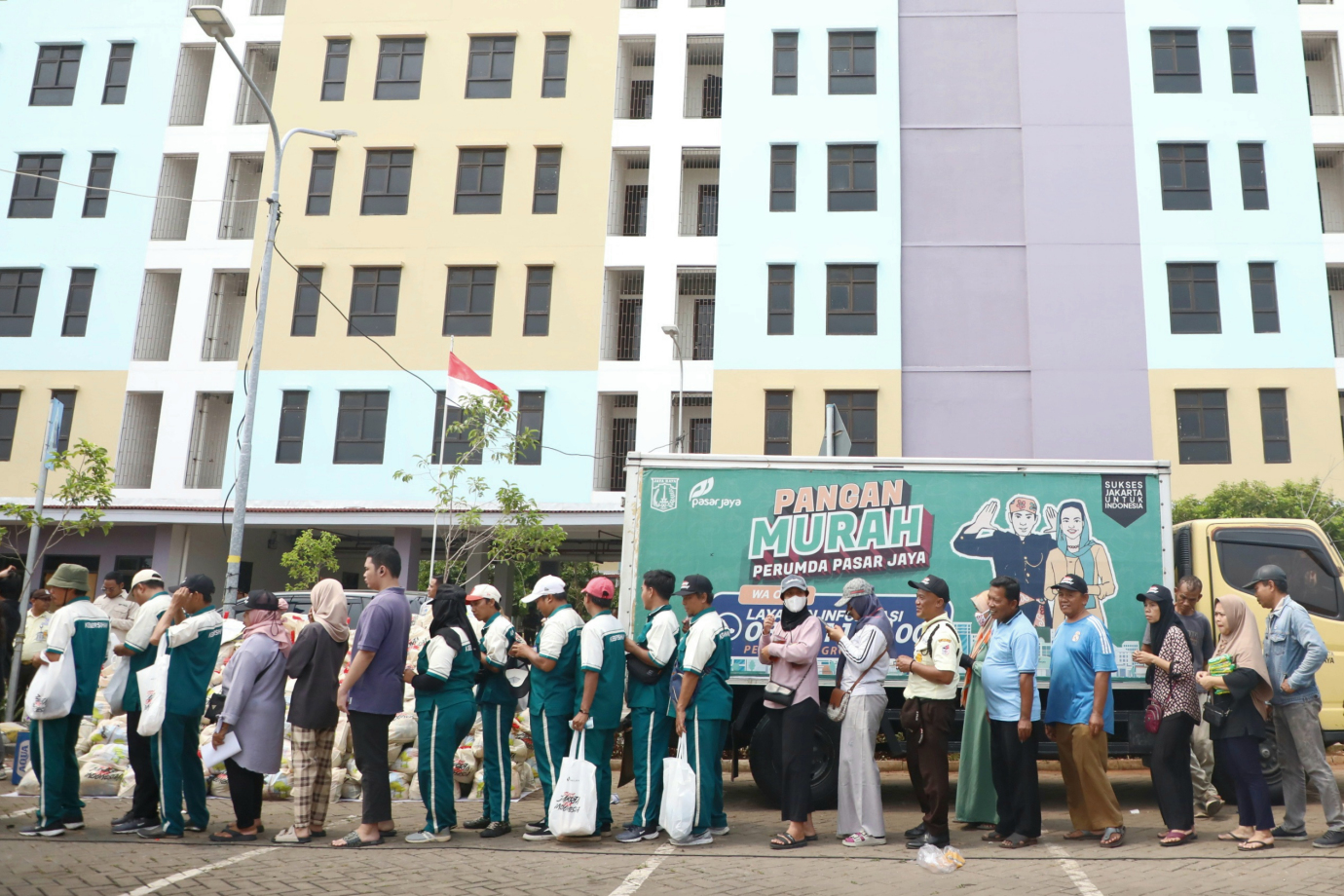 Penjabat (Pj) Gubernur DKI Jakarta, Heru Budi Hartono meninjau program sembako murah di Rusun Rorotan, Jalan Rorotan IV, Rorotan, Cilincing, Jakarta Utara, Senin (23/9). Dalam kegiatan ini sebanyak 1.600 paket sembako murah disediakan dengan harga Rp.100.000 per paket terdiri dari beras lima kilogram, minyak goreng dua liter, gula satu kilogram dan tepung satu kilogram.