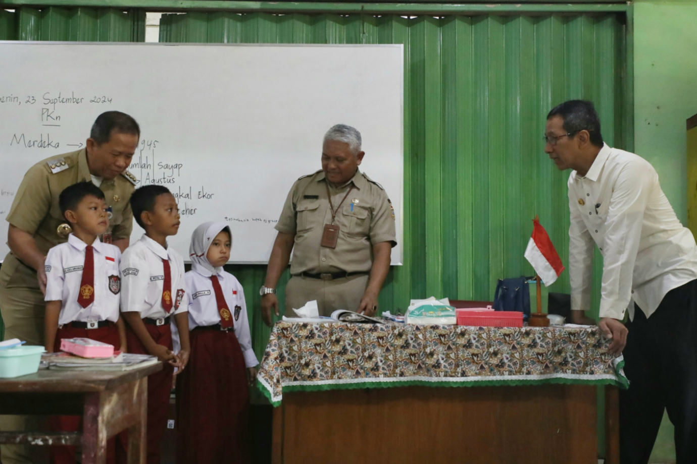 Penjabat (Pj) Gubernur DKI Jakarta, Heru Budi Hartono meninjau kegiatan makanan bergizi gratis di SDN 03 Rorotan, Jalan Rorotan XI, Rorotan, Cilincing, Jakarta Utara, Senin (23/9). Dalam kegiatan ini sebanyak 900 paket makan dibagikan kepada para siswa SDN 03 Rorotan hasil kerja sama Pemprov DKI Jakarta dengan BUMD Jakpro.