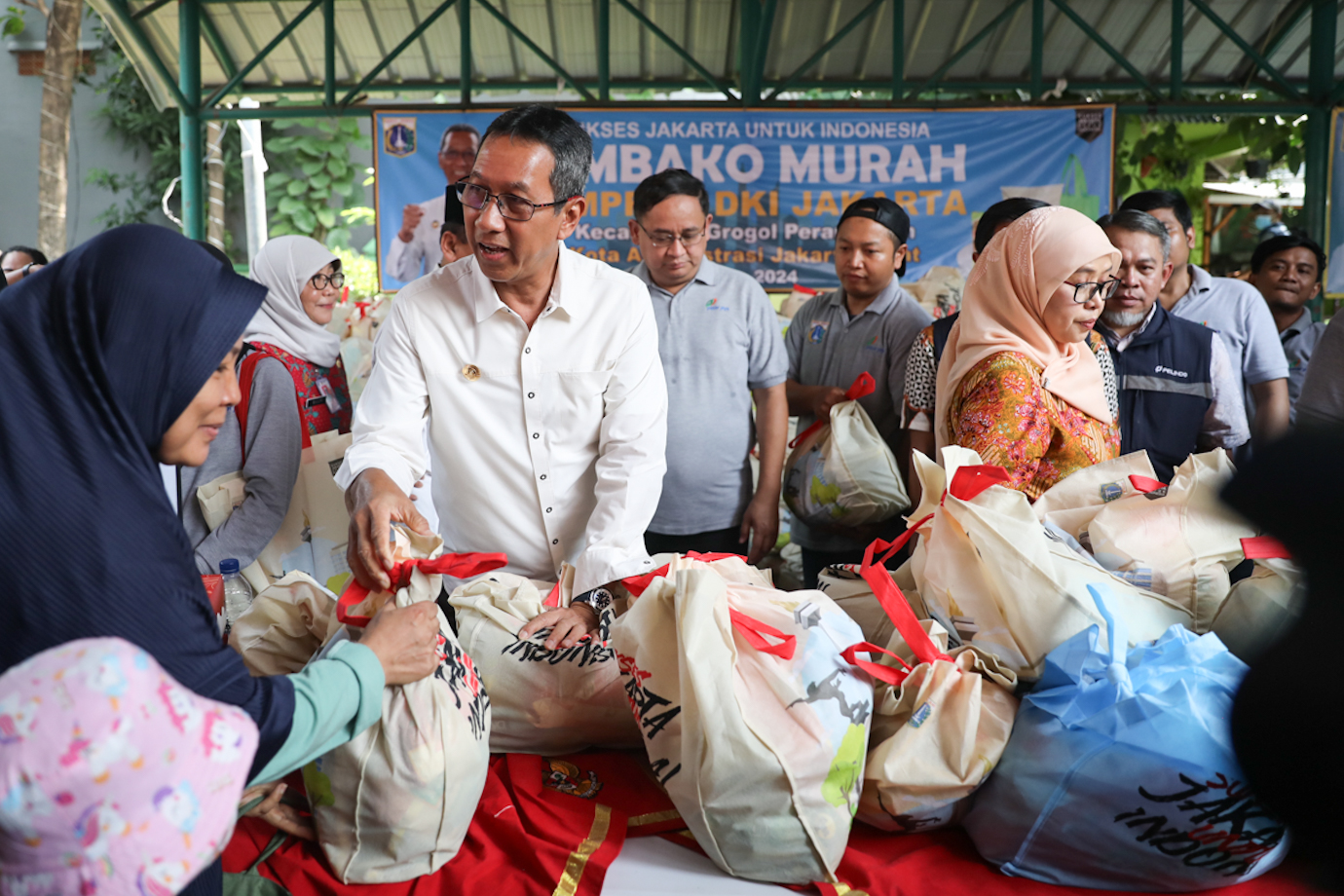 Penjabat (Pj) Gubernur DKI Jakarta, Heru Budi Hartono meninjau kegiatan sembako murah di Kantor Kecamatan Grogol Petamburan, Jakarta Barat, Jumat (20/9). Pemprov DKI melalui Perumda Dharma Jaya, Perumda Pasar Jaya dan PT Food Station Tjipinang Jaya menyediakan 3.000 paket sembako murah dengan harga Rp100.000 per paket.