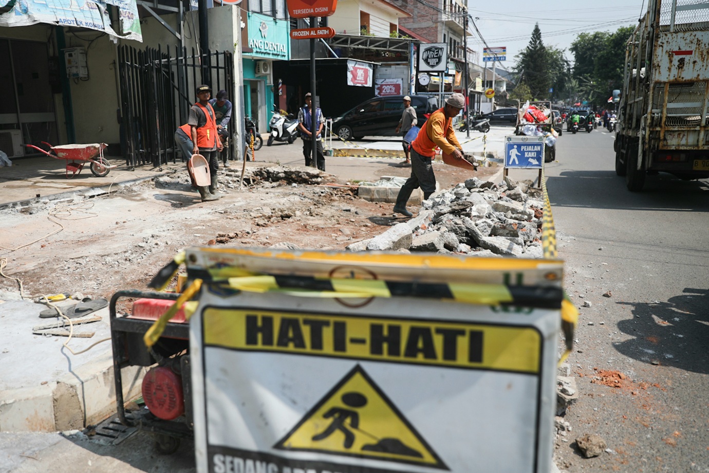 Pemprov DKI Jakarta melakukan revitalisasi trotoar di Jalan Pondok Kelapa Raya RW 04, 11 dan 14, Pondok Kelapa, Duren Sawit, Jakarta Timur, Jumat (13/9). Progres pengerjaan revitalisasi trotoar yang dimulai sejak Agustus 2024 tersebut telah mencapai 40 persen dan ditargetkan selesai pada November mendatang.