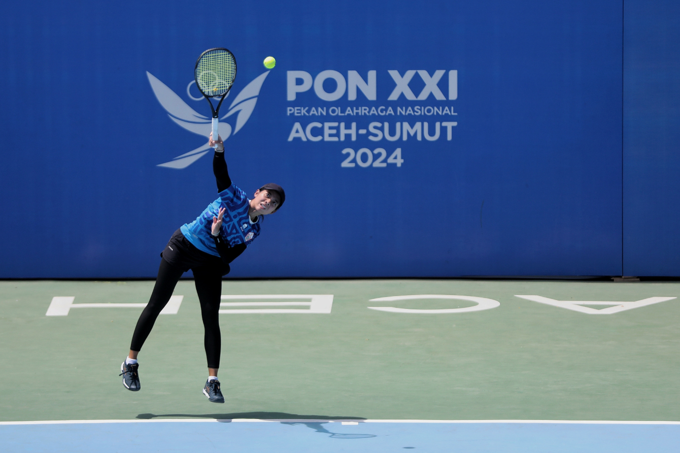 Tim tenis DKI Jakarta berhasil melaju ke babak final nomor beregu putri setelah mengalahkan tim Papua Barat di semifinal PON XXI Aceh-Sumut 2024 di Stadion Harapan Bangsa, Banda Aceh, Jumat (13/9). Dalam final nanti tim tenis DKI Jakarta akan berhadapan dengan tim Jawa Timur yang menjadi lawan terakhir dalam perebutan medali emas. #kabarpon2024