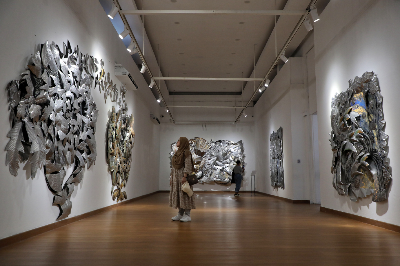 Melihat pameran seni rupa \"Infinity Yin Yang\" karya Lini Natalini Widhiasi di Galeri Nasional, Gambir, Jakarta Pusat, Jumat (6/9). Karya-karya dalam pameran ini menafsirkan konsep \"Infinity Yin Yang\" dengan menggunakan bahan aluminium dan stainless steel, material yang tidak hanya menawarkan kekokohan visual tetapi juga menunjukkan fleksibilitas dan ketahanan dalam penciptaan seni.