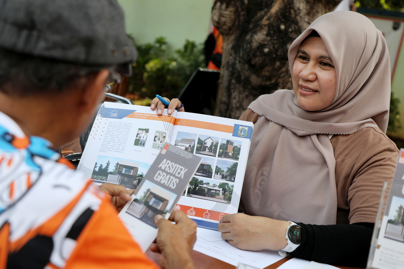 Puluhan warga mengikuti kegiatan talkshow yang dikemas dalam kegiatan ngobrol pagi (Ngopi) di halaman kantor Kelurahan Pondok Kelapa, Duren Sawit, Jakarta Timur, Jumat (6/9). Program Ngopi ini merupakan inovasi dari UP PMPTSP, dimana unit ini memiliki terobosan baru dalam meningkatkan kualitas pelayanannya berupa layanan pembuatan gambar arsitek secara gratis.