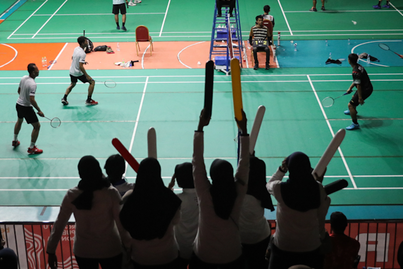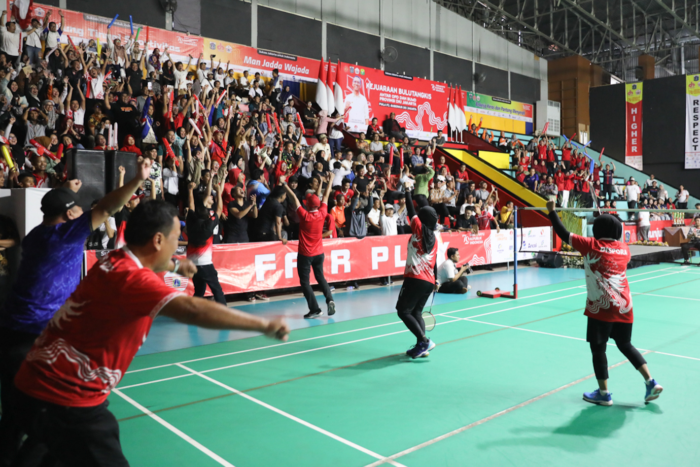 Ratusan penonton mendukung pemain jagoannya pada hari ketiga kejuaraan bulutangkis Piala Pj Gubernur 2024 di Gelanggang Remaja Jakarta Timur, Jatinegara, Rabu (21/8). Pada hari ketiga kejuaraan yang mempertandingkan tim-tim dari OPD dan BUMD DKI Jakarta tersebut, sebanyak 24 partai dari nomor beregu campuran, ganda putra dan ganda putri dipertandingkan.