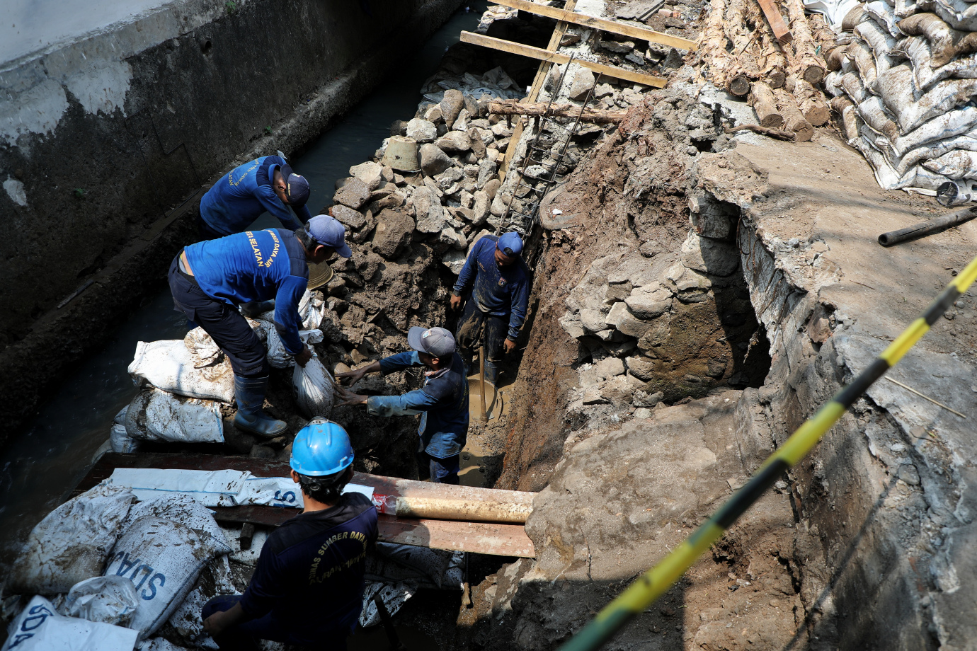 Satuan Pelaksana Sumber Daya Air (Satpel SDA) Kecamatan Tebet lakukan perbaikan turap longsor di Phb Rawa Bilal, Jalan Tebet Barat Dalam Raya, Tebet, Jakarta Selatan, Rabu (21/8). Turap Phb longsor sepanjang 10 meter akibat hujan lebat pada empat Agustus 2024.