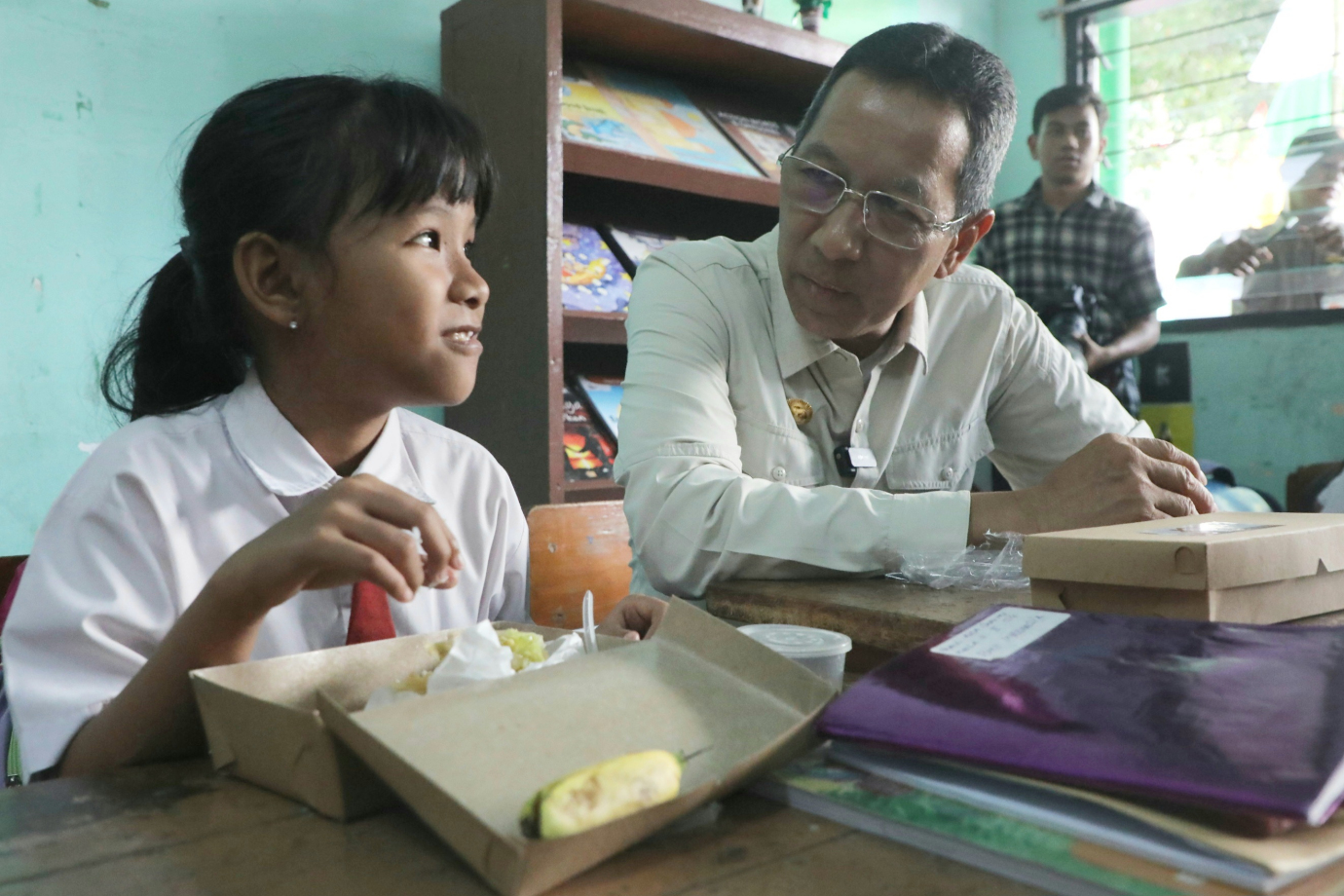 Penjabat (Pj) Gubernur DKI Jakarta, Heru Budi Hartono melakukan kunjungan ke kompleks Sekolah Dasar Negeri (SDN) 07 Cideng, Jalan Sangihe, Kecamatan Gambir Jakarta Pusat, Senin (19/8). Dalam kunjungan ini Pj Gubernur meninjau uji coba makan bergizi gratis kepada 498 siswa di kompleks SDN Cideng 07, yang terdiri dari 288 siswa SDN 07 Cideng, 178 siswa SDN Duri Pulo 04, 12 siswa Sanggar Kegiatan Belajar Negeri 23 dan 20 siswa Kelompok Belajar Negeri 23.