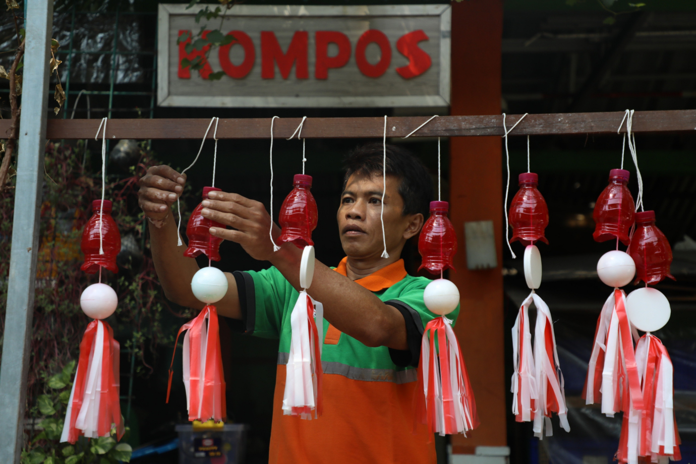 Dalam Rangka menyambut Hari Ulang Tahun ke-79 Republik Indonesia petugas Satuan Pelaksana Lingkungan Hidup (Satpel LH) Kecamatan Gambir mengubah sampah botol bekas menjadi hiasan gantungan bernuansa merah putih di Tempat Pengolahan Sampah Reduce, Reuse and Recycle (TPS 3R) Ketapang, Jalan Kyai Haji Zainul Arifin, Kelurahan Duri Pulo, Jakarta Pusat, Rabu (14/8). Dalam satu hari petugas dapat membuat hingga 30 hiasan gantungan dengan menggunakan 60 botol bekas yang didapat dari warga sekitar.
