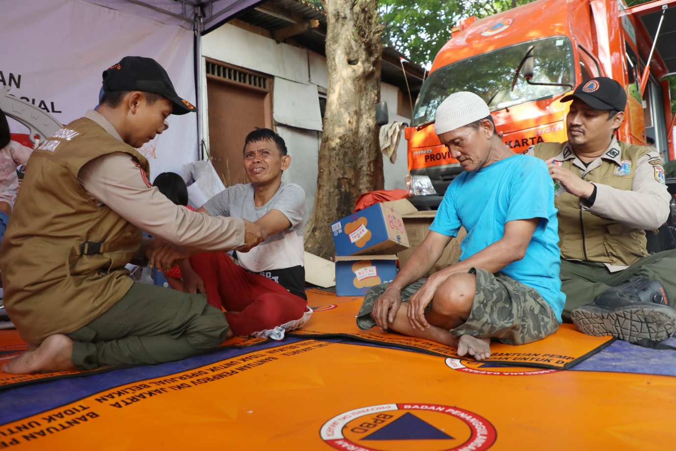 Badan Penanggulangan Bencana Daerah (BPBD) Provinsi DKI Jakarta membuka layanan pijat refleksi untuk warga penyintas kebakaran Manggarai di posko pengungsian di halaman parkir Pasaraya Manggarai, Setiabudi Jakarta Selatan, Kamis (15/8). Layanan pijat refleksi ini merupakan bagian dari layanan dukungan psikososial (LDP) BPBD Provinsi DKI Jakarta untuk mengembalikan kesehatan warga penyintas kebakaran Manggarai.