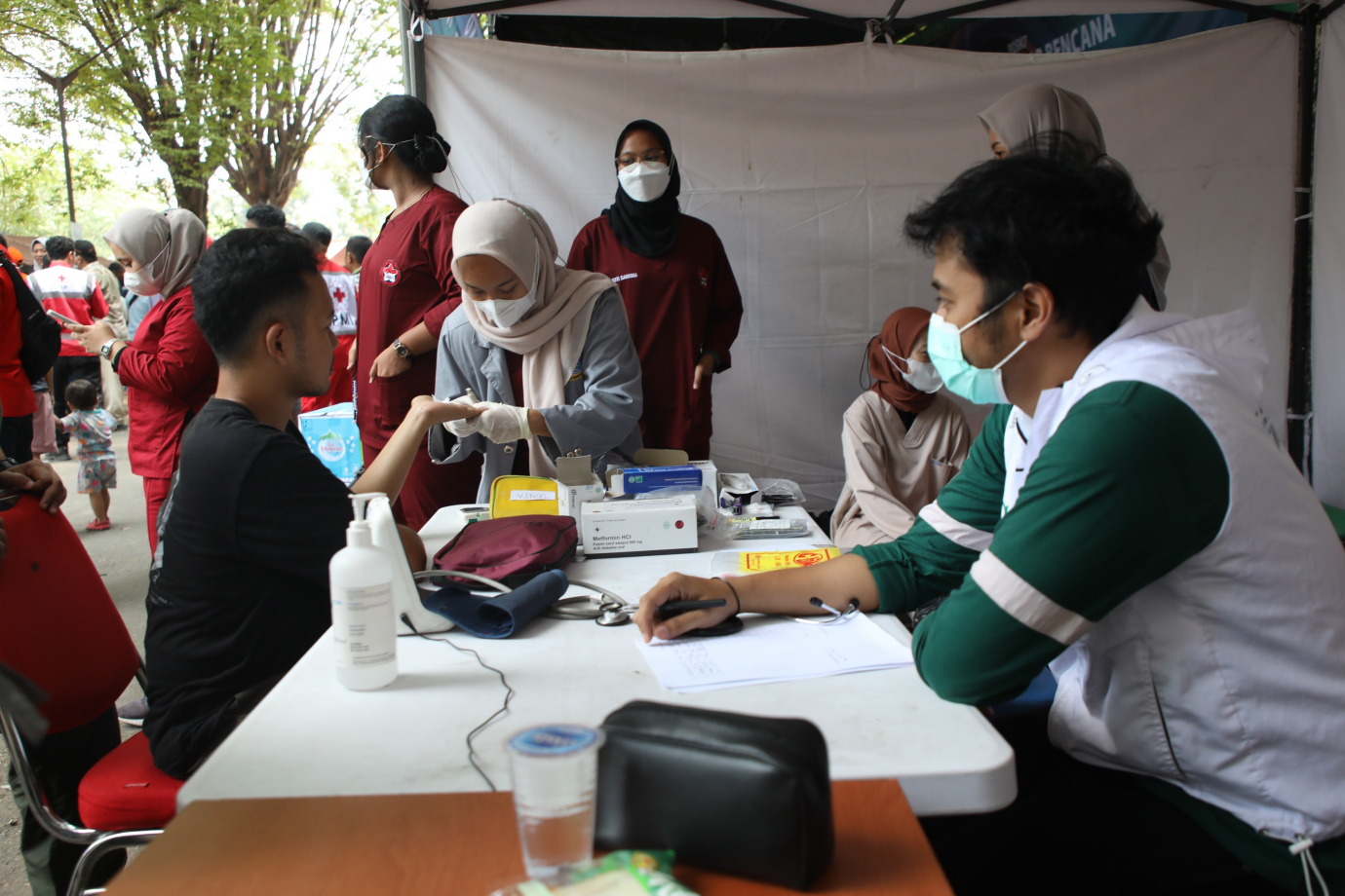 Suku Dinas Kesehatan (Sudinkes) Jakarta Selatan memberikan pelayanan pemeriksaan kesehatan pada penyintas kebakaran Manggarai di Posko Pengungsian halaman parkir Pasaraya Manggarai, Setiabudi, Jakarta Selatan, Kamis (15/8). Pelayanan yang diberikan antara lain pemeriksaan fisik, pemeriksaan tensi, pemberian obat, pemeriksaan gula darah dan pemeriksaan kolesterol.