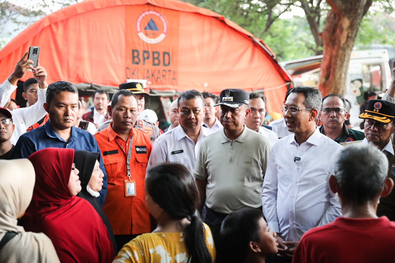Penjabat (Pj) Gubernur DKI Jakarta, Heru Budi Hartono mengunjungi lokasi pengungsian warga terdampak kebakaran Manggarai di area parkir Pasaraya Manggarai, Jakarta Selatan, Rabu (14/8). Kunjungan Pj Gubernur untuk memastikan penanganan Pemprov DKI melalui SKPD terkait terhadap warga terdampak bencana kebakaran berjalan optomal.