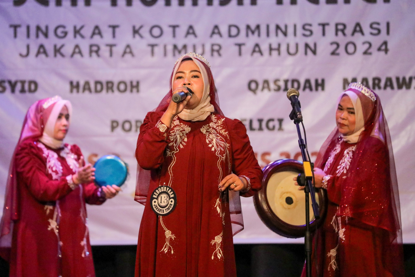 Suku Dinas (Sudin) Kebudayaan Jakarta Timur menggelar Lomba Apresiasi dan Seni Nuansa Religi 2024 di Gedung Pusat Pelatihan Seni Budaya (PPSB) Kisam Dji\'un, Jalan H Naman, Pondok Kelapa, Duren Sawit, Jakarta Timur, Selasa (13/8). Kegiatan yang digelar dari tanggal 12-16 Agustus 2024 ini diikuti 83 grup dari 10 kecamatan di Jakarta Timur dengan memperlombakan lima kategori antara lain, nasyid, hadrah, kasidah, marawis dan pop akustik religi.