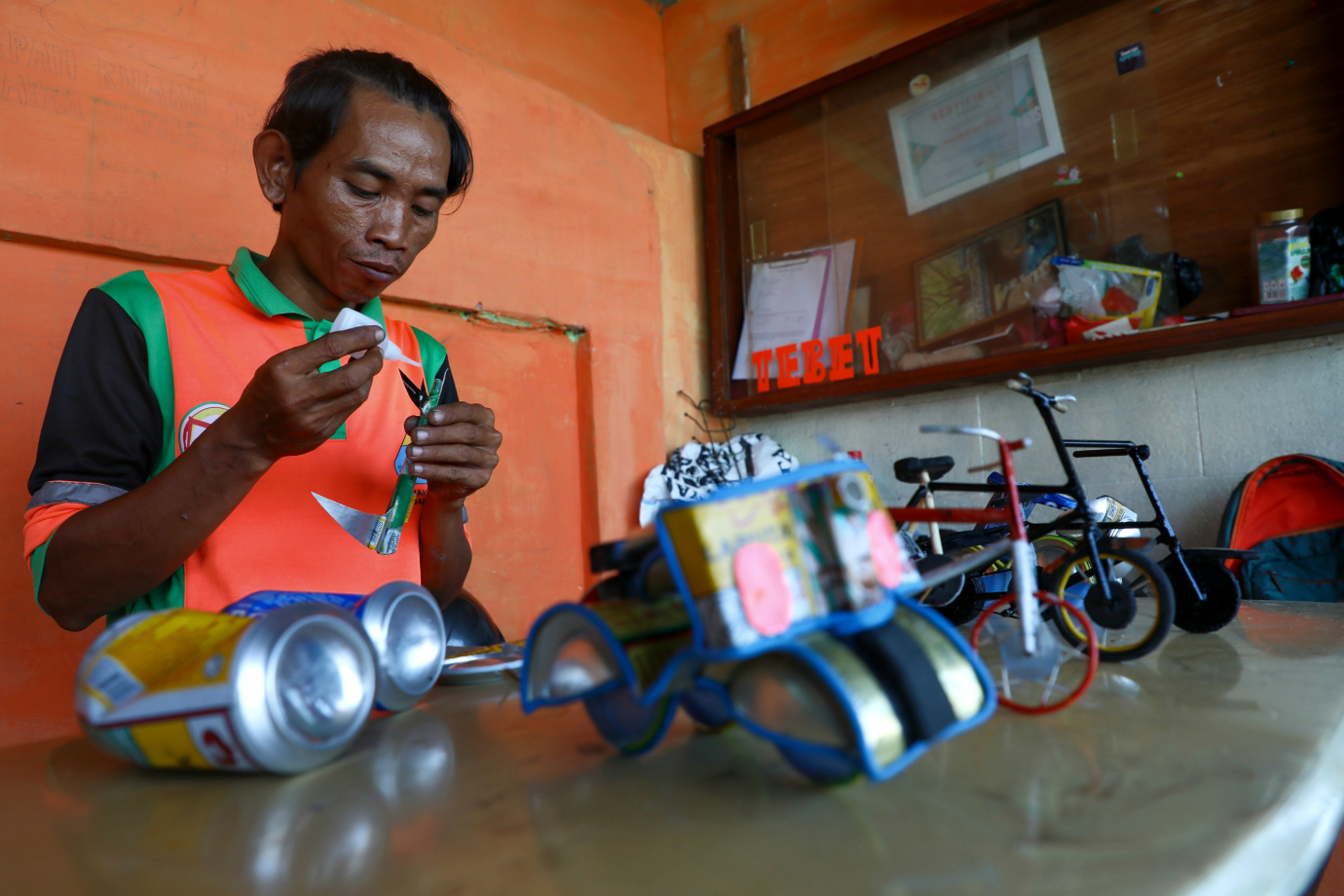 Petugas Unit Penanganan Sampah Badan Air (UPS BA) Kecamatan Tebet mengubah kaleng bekas menjadi miniatur sepeda dan motor di Posko UPS Badan Air Kecamatan Tebet, Jalan Inspeksi Ciliwung, Bukit Duri, Jakarta Selatan, Jumat (9/8). Dalam pembuatan satu miniatur petugas bisa menggunakan empat hingga tujuh kaleng bekas yang didapat dari aliran Kali Ciliwung.