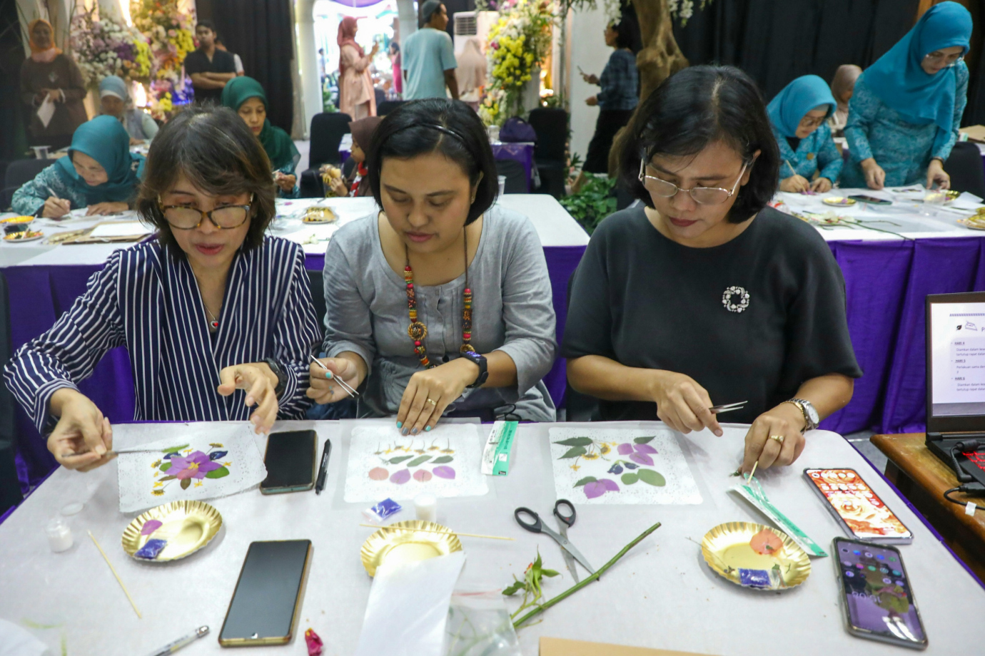 Sebanyak 46 peserta mengikuti kegiatan kursus merangkai bunga dalam acara Festival Bunga Rawa Belong 2024 di Pasar Bunga Rawa Belong, Jalan Sulaiman, Kebon Jeruk, Jakarta Barat, Rabu (7/8). Dalam kegiatan ini peserta diajarkan merangkai bunga dengan teknik Oshibana seni merangkai atau menghias dengan bunga atau dedaunan yang dikeringkan dengan cara ditekan.