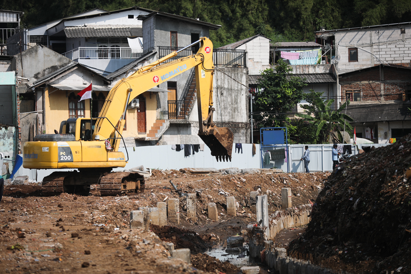 Sejumlah pekerja mengerjakan proyek normalisasi Kali Ciliwung di kawasan Rawajati, Pancoran, Jakarta Selatan, Selasa (6/8). Pemprov DKI Jakarta sedang menyelesaikan proyek normalisasi Kali Ciliwung sepanjang 33 kilometer sebagai upaya penanggulangan banjir di sebagian wilayah Jakarta.