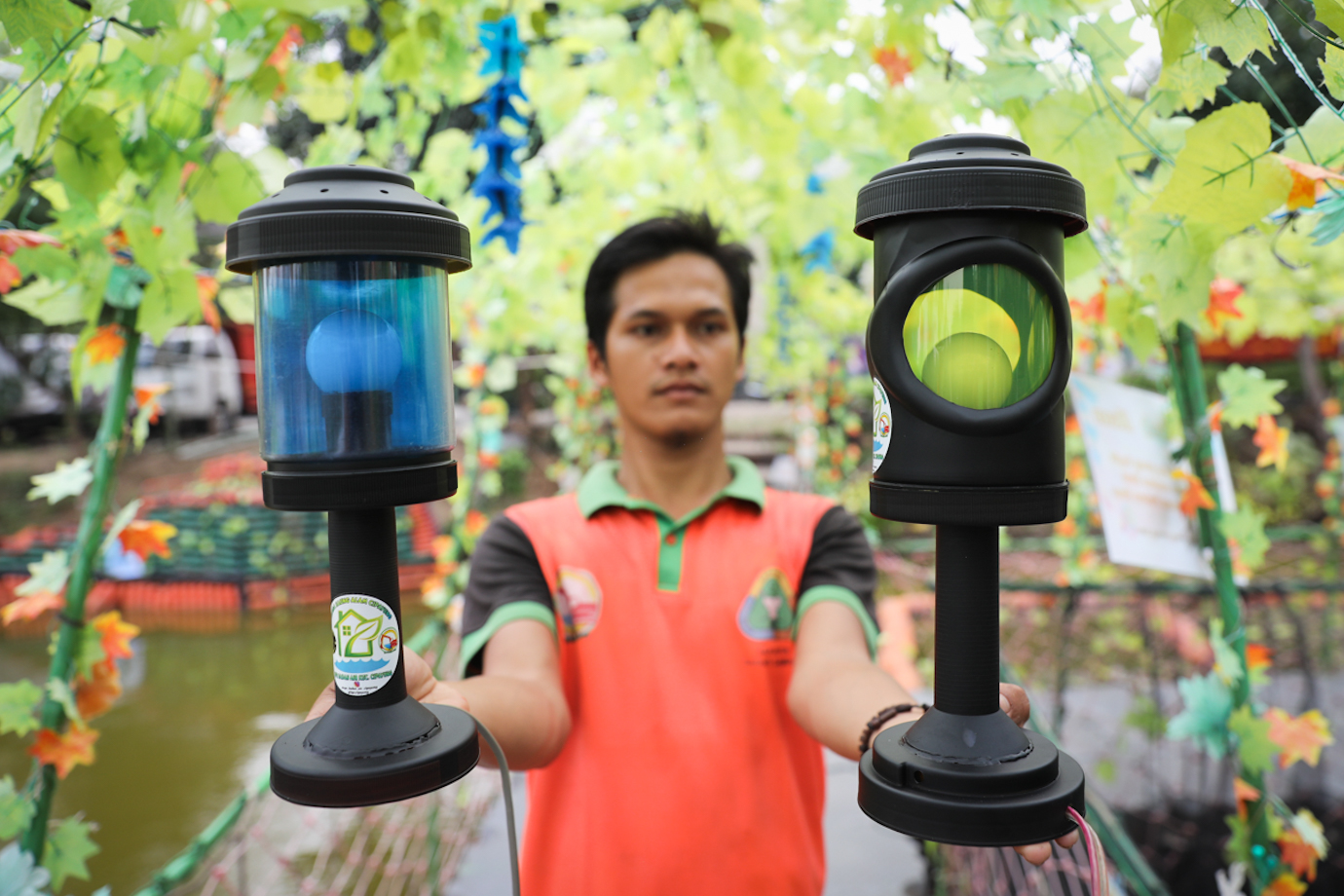 Petugas Unit Penanganan Sampah Badan Air (UPS BA) Dinas Lingkungan Hidup Kecamatan Cipayung membuat lampu tidur dari sampah di Waduk Setu, Cipayung, Jakarta Timur, Jumat (2/8). Pembuatan lampu tidur yang dinamai Lampu Rekreatif (Reusable-Kreatif) tersebut memanfaatkan sampah wadah makanan dan roll benang jahit yang sudah tidak terpakai.