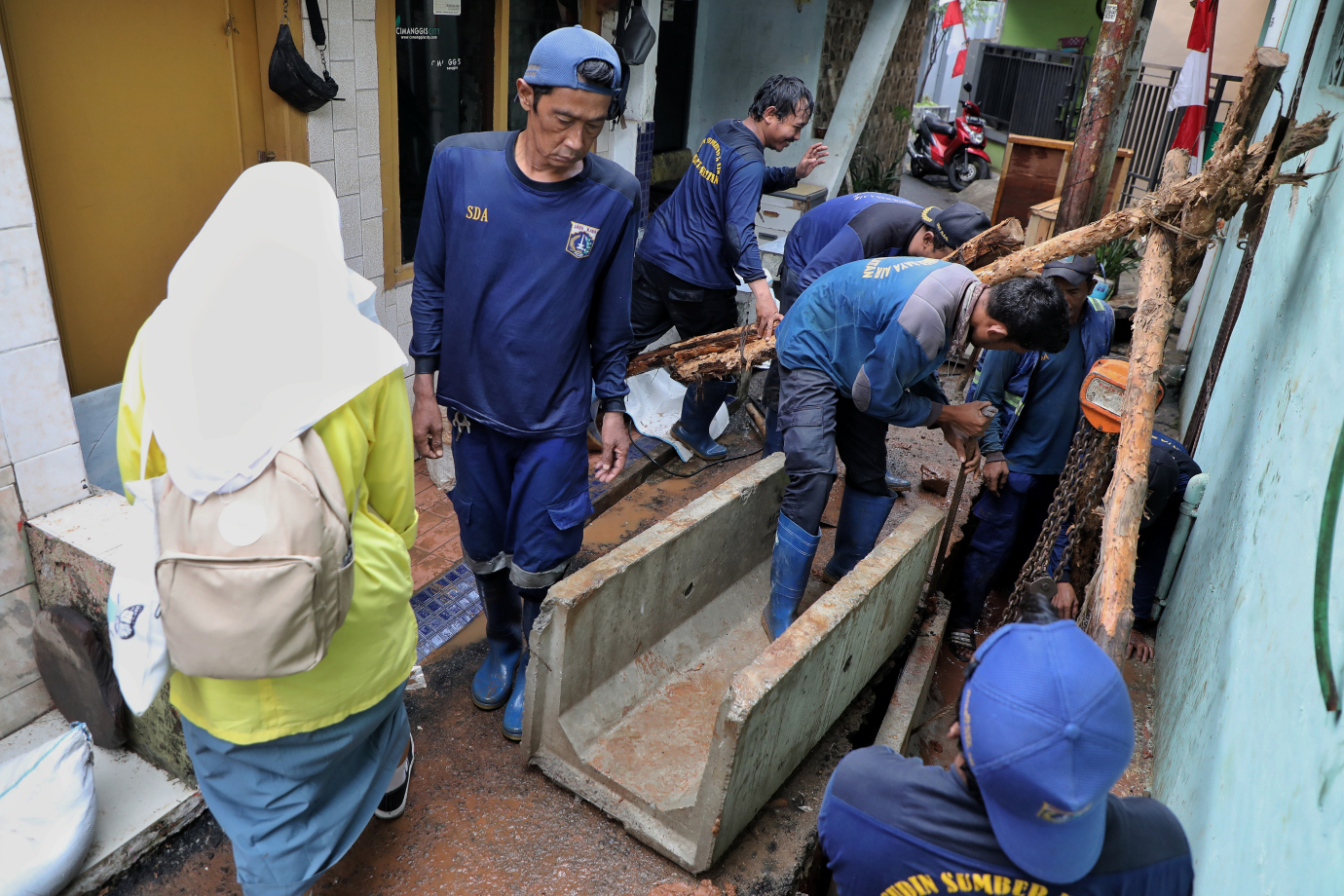 Satuan Pelaksana Sumber Daya Air (Satpel SDA) Kecamatan Tebet melakukan pemasangan U-ditch baru di Jalan Swadaya ll, Manggarai, Tebet, Jakarta Selatan, Jumat (2/8). Pemasangan U-ditch baru sepanjang 150 meter tersebut sudah mencapai 50 persen.