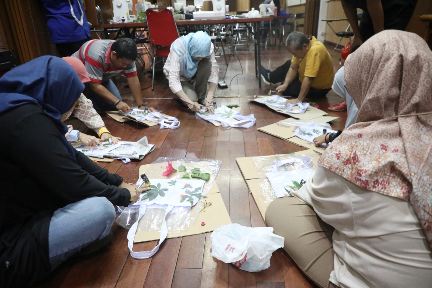 Suku Dinas Perindustrian, Perdagangan, Koperasi dan Usaha Kecil dan Menengah (Sudin PPUPKM) Jakarta Timur melalui Tempat Kumpul Kreatif (TKK) menggelar Workshop Ecoponding on Totebag di TKK Jatinegara Kaum, Kamis (25/7). Sebanyak 10 peserta mengikuti pelatihan ini dan peserta diajarkan teknik percetakan yang menggunakan bahan-bahan organik berupa daun, bunga dan batang tanaman untuk membuat pola pada kain yang disebut dengan teknik Ecoprint.