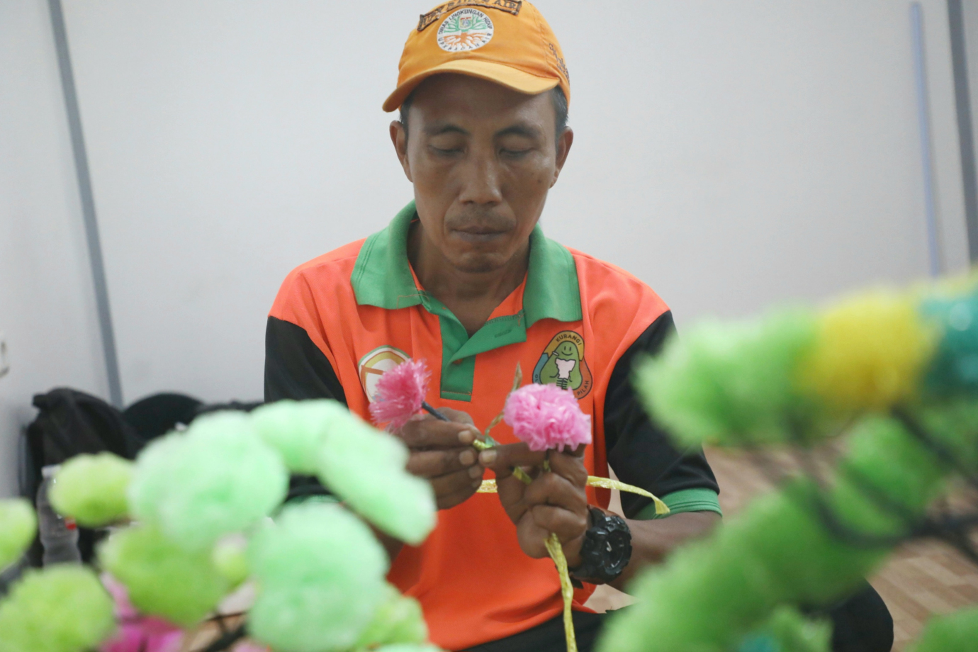 Petugas Unit Pengelola Sampah Badan Air (UPS BA) Kecamatan Gambir mengubah sampah plastik menjadi hiasan bonsai, di Markas UPS BA Kecamatan Gambir, Jalan perwira, Jakarta Pusat, Kamis (25/7). Pembuatan hiasan bonsai yang memiliki tinggi 30 sentimeter ini menggunakan 30 bahan plastik bekas yang didapat dari aliran Kali di Kecamatan Gambir.