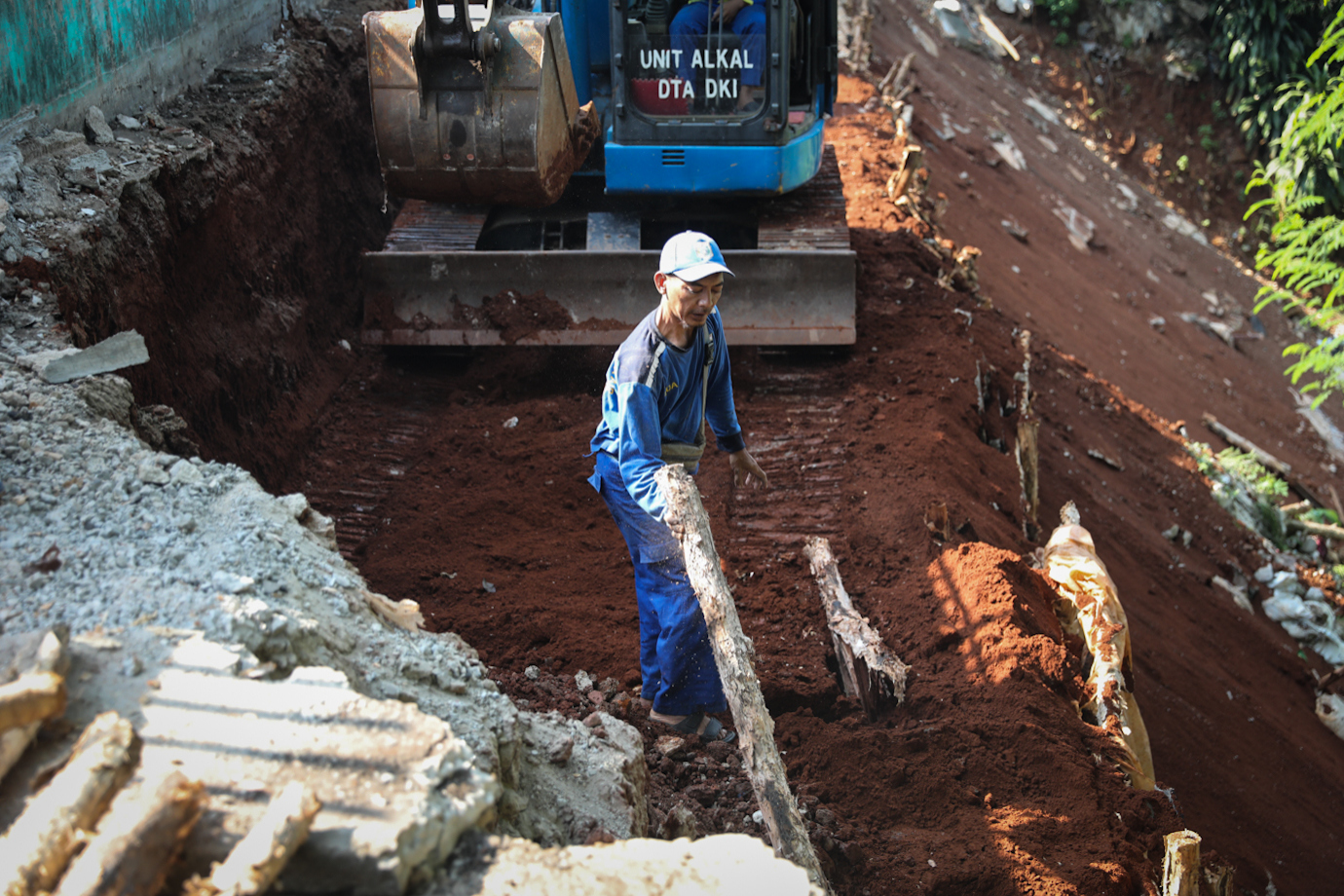Petugas Satuan Pelaksana Dinas Sumber Daya Air (Satpel SDA) Kecamatan Pasar Rebo melakukan penanganan turap longsor di Jalan Kesehatan RT 04/RW 11, Gedong, Pasar Rebo, Jakarta Timur, Rabu (17/7). Perbaikan turap dan jalan amblas sepanjang 30 meter ini melibatkan 12 petugas setiap harinya dan menggunakan satu unit alat berat mini.