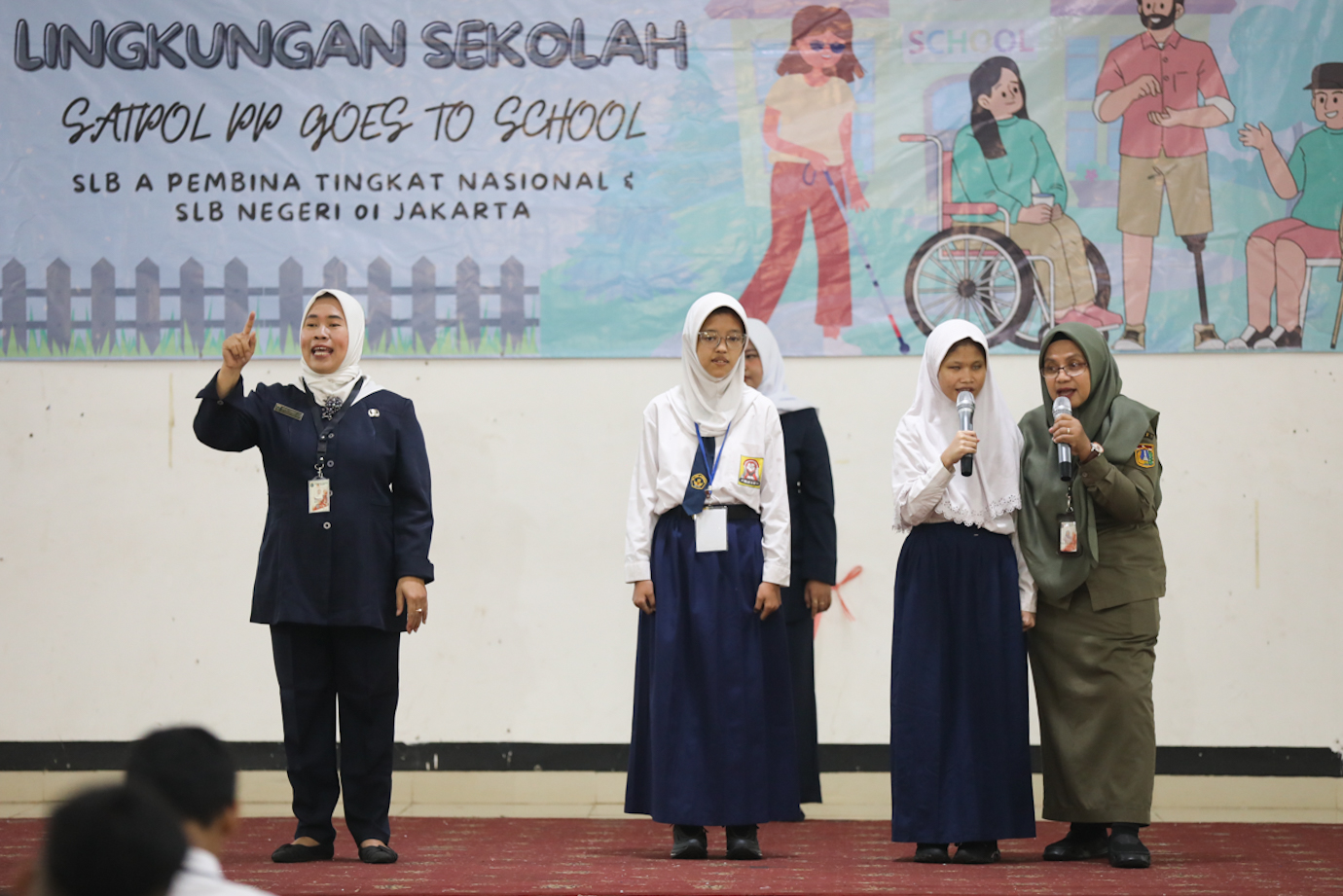 Satuan Polisi Pamong Praja (Satpol PP) DKI Jakarta menyambangi Sekolah Luar Biasa (SLB) Negeri 01 dan SLB A (Tunanetra) Pembina Tingkat Nasional, Lebak Bulus, Cilandak, Jakarta Selatan, Senin (8/7). Kegiatan bertajuk Satpol PP Goes to School tersebut dilaksanakan bersamaan dengan Masa Pengenalan Lingkungan Sekolah (MPLS) hari pertama pada tahun ajaran 2024/2025.