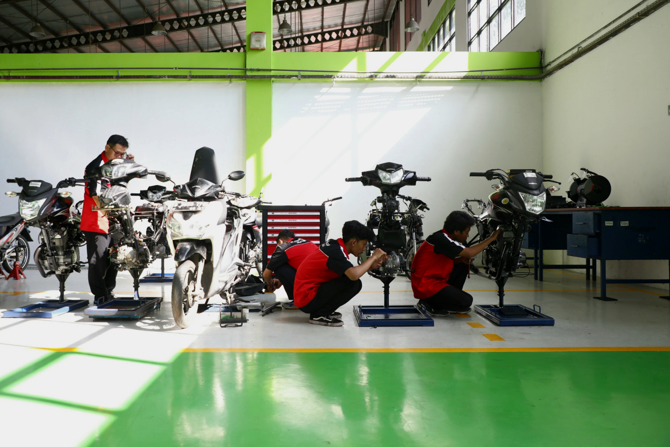 Sebanyak 20 peserta mengikuti pelatihan teknik otomotif sepeda motor di Pusat Pelatihan Kerja Daerah (PPKD) Jakarta Timur, Jalan H Naman, Duren Sawit Jakarta Timur, Rabu (26/6). Dalam pelatihan ini para peserta diberikan pelatihan dasar teknik otomotif sepeda notor dari perawatan dan perbaikan engine, sistem pemindah tenaga motor dan sistem kelistrikan sepeda motor.