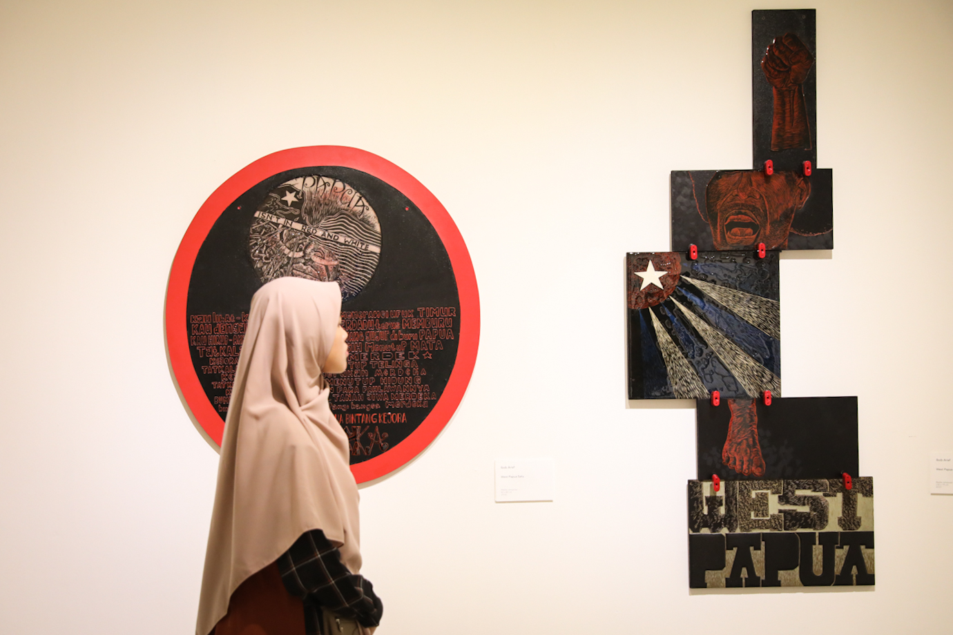 Sejumlah pengunjung mengamati karya yang ditampilkan dalam Pameran Sampai Batas Tarung di Gedung D Galeri Nasional, Gambir, Jakarta Pusat, Selasa (25/6). Pameran yang menampilkan karya-karya seniman Sanggar Bumi Tarung yang berbasis di Yogyakarta tersebut menghadirkan karya seni rupa berupa lukisan, patung dan relief bergaya realisme revolusioner.