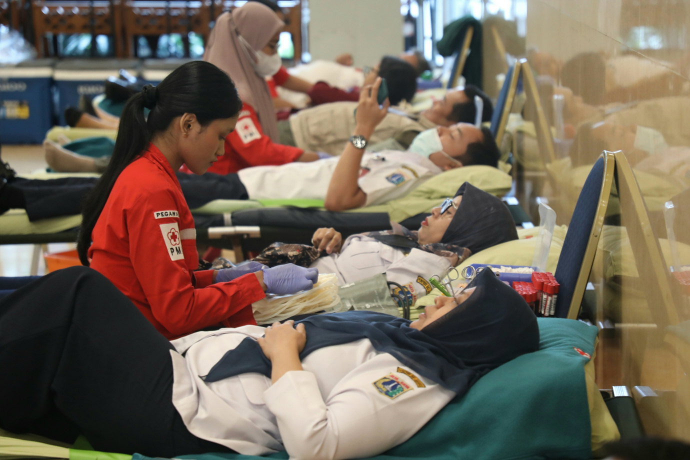 Pemerintah Provinsi DKI Jakarta melalui Badan Kepegawaian Daerah (BKD) bersama Palang Merah Indonesia (PMI) DKI Jakarta menggelar kegiatan donor darah di Balai Pertemuan Grha Ali Sadikin, Balai Kota DKI Jakarta, Gambir, Jakarta Pusat, Rabu (19/6). Kegiatan ini digelar selama dua hari yakni 19-20 Juni 2024 dalam rangka menyambut HUT Kota Jakarta ke-497. #hutjakarta2024