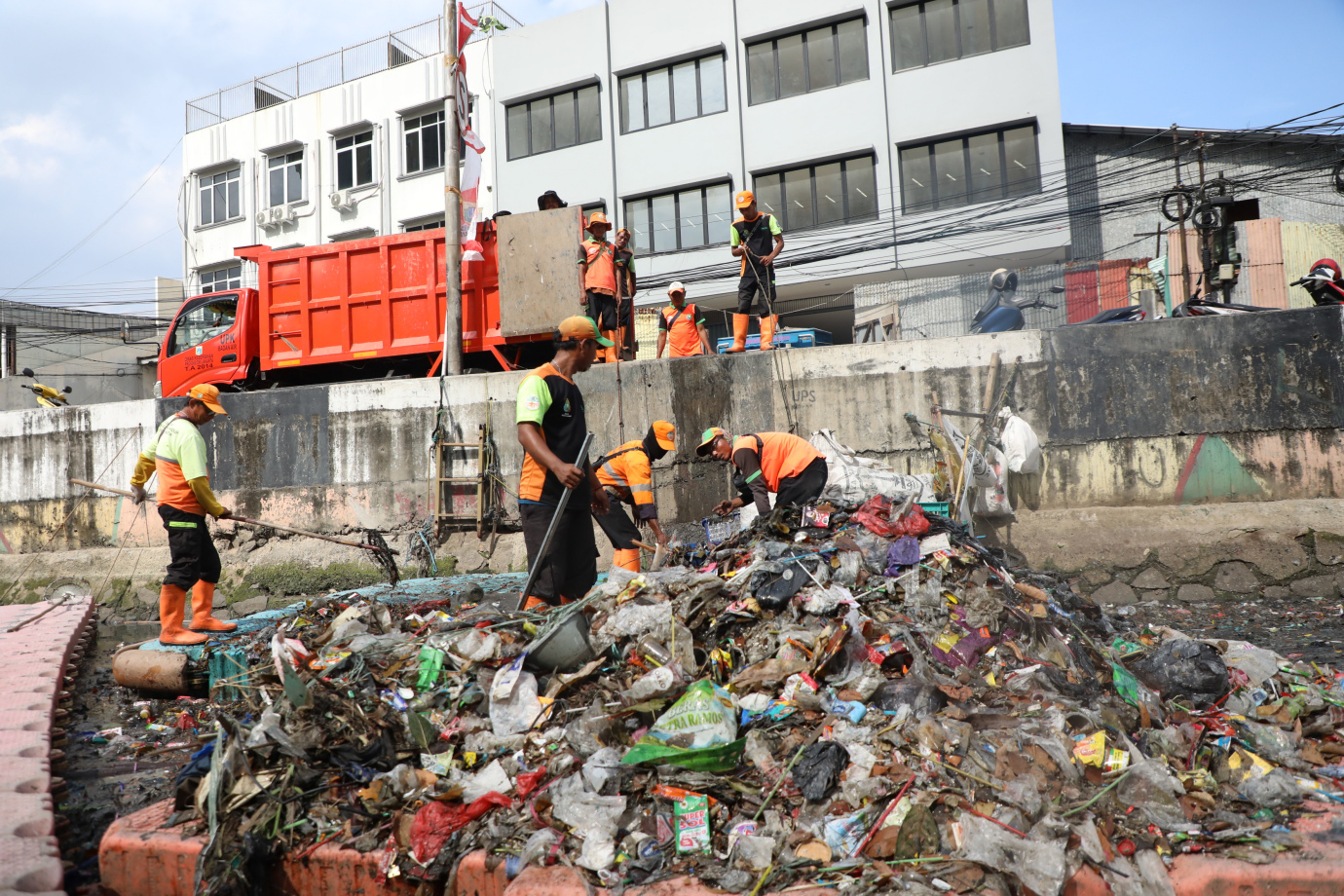 Petugas Unit Penanganan Sampah Badan Air (UPS BA) Dinas Lingkungan Hidup DKI Jakarta Kecamatan Tanjung Priok membersihkan sampah di aliran Kali Sentiong, Jalan Sunter Jaya, Jakarta Utara, Kamis (13/6). Dalam satu hari petugas bisa mengangkut sembilan kubik sampah.