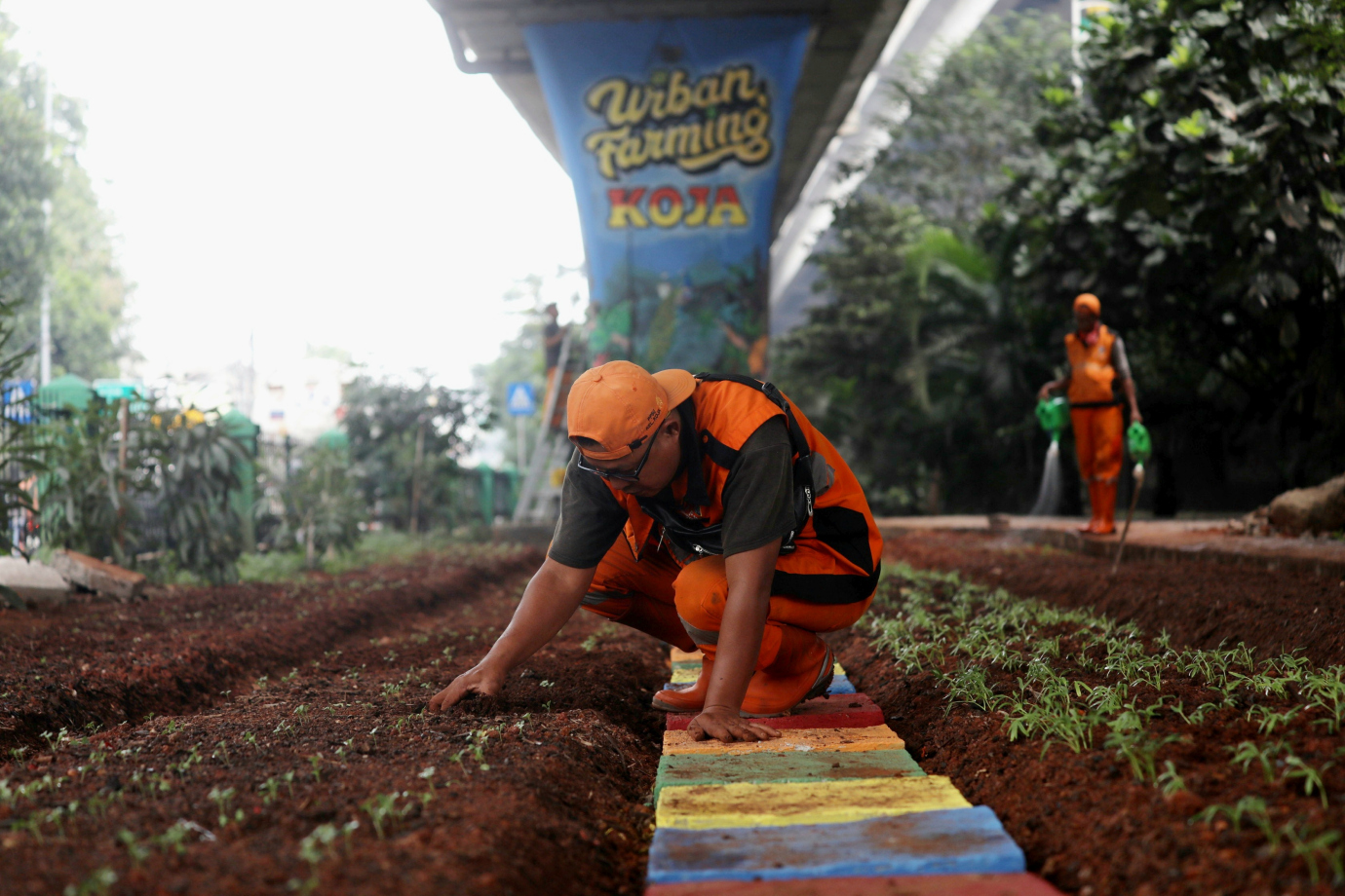 Petugas Penanganan Prasarana dan Sarana Umum (PPSU) Kelurahan Koja menata area kolong tol Jampea menjadi kawasan Urban farming Taman Jampea, Jalan Jampea, Koja, Jakarta Utara, Rabu (12/6). Kawasan Urban Farming yang memiliki luas 1.050 meter persegi ini merupakan bagian dari penataan kawasan unggulan triwulan ke-2 tahun 2024 kelurahan Koja.