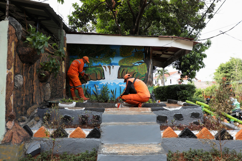 Petugas Penanganan Prasarana dan Sarana Umum (PPSU) Kelurahan Cijantung melakukan penataan kawasan unggulan triwulan dua di Jalan RA Fadillah RT.04 RW.04, Pasar Rebo, Jakarta Timur, Senin (10/6). Kawasan unggulan yang memiliki konsep taman batu alam ini bisa dikatakan sudah rampung sejak kemarin, tinggal menyelesaikan hal-hal kecil agar lebih detail.