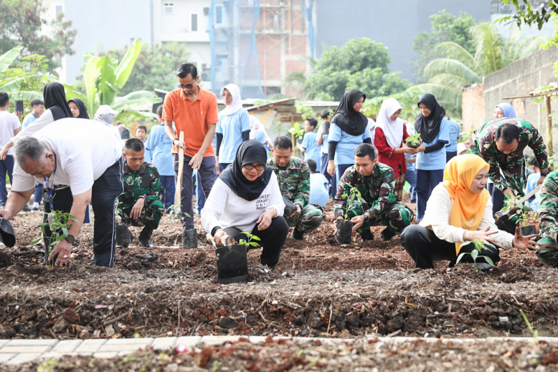Dinas Ketahanan Pangan, Kelautan dan Pertanian (KPKP) DKI Jakarta bersama alumni Akademi Militer (Akmil) angkatan 2014 dan pelajar SMP Negeri 270 melakukan penanaman bersama di Jalan Kompi Udin, Pegangsaan Dua, Kelapa Gading, Jakarta Utara, Jumat (31/5). Penanaman bersama dilakukan untuk menumbuhkan kesadaran pelajar dan masyarakat dalam memanfaatkan lahan untuk pertanian perkotaan (urban farming).