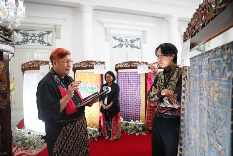 Sejumlah pengunjung mengamati kain batik motif Betawi karya finalis Lomba Desain Motif Batik Betawi 2024 di Balairung Balai Kota DKI Jakarta, Gambir, Jakarta Pusat, Kamis (30/5). Sebanyak 15 desain motif menjadi karya unggulan dalam lomba yang digelar untuk memperkaya keragaman batik Betawi tersebut.