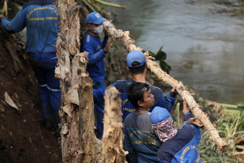 Petugas Suku Dinas Sumber Daya Air Jakarta Timur melakulan penanganan longsor di Bantaran Kali Ciliwung, Gang Amd 28 I, Balekambang, Kramat Jati, Jakarta Timur, Kamis (30/5). Penanganan yang dilakukan berupa pemasangan kayu dolken untuk menghindari longsor lanjutan.