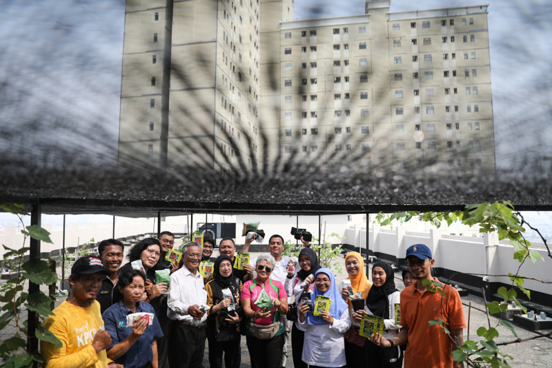 Sejumlah petugas mebudidayakan tanaman buah di lantai atap (rooftop) Apartemen Gading Nias, Jalan Pegangsaan Dua, Kepala Gading, Jakarta Utara, Jumat (31/5). Pemanfaatan rooftop pertanian perkotaan (urban farming) ini dibina dan dibantu langsung oleh Dinas Ketahanan Pangan, Kelautan dan Pertanian (KPKP) DKI Jakarta.