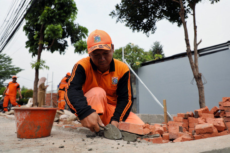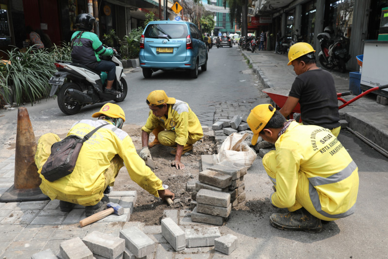 Petugas Satuan Pelaksana (Satpel) Bina Marga Kecamatan Sawah Besar melakukan perbaikan bidang Jalan Pasar Baru, Sawah Besar, Jakarta Pusat, Rabu (23/5). Perbaikan jalan yang melibatkan enam petugas tersebut merupakan tindak lanjut dari laporan warga melalui salah satu kanal di Cepat Respon Masyarakat (CRM).