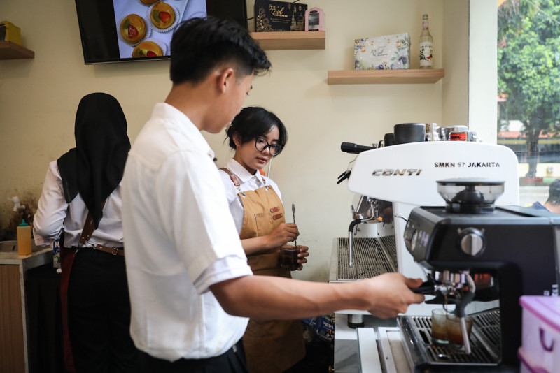 Sejumlah pelajar SMKN 57 Jakarta melakukan praktik menjadi barista di D\'New Ragoon Cafe, Pasar Minggu, Jakarta Selatan, Jumat (24/5). D\'New Ragoon Cafe merupakan tempat praktik untuk menjual aneka minuman dan kue hasil dari pendidikan materi barista dan pastry.