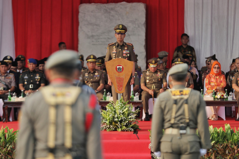 Penjabat (Pj) Gubernur DKI Jakarta, Heru Budi Hartono memimpin upacara peringatan Hari Ulang Tahun (HUT) ke-74 Satuan Polisi Pamong Praja (Satpol PP) dan HUT ke-62 Satuan Tugas Perlindungan Masyarakat (Satlinmas) DKI Jakarta di Lapangan Silang Monas, Gambir, Jakarta Pusat, Jumat (17/5). Dalam kesempatan tersebut, Pj Gubernur mengapresiasi kinerja Satpol PP dan Satlinmas yang menjalankan tugas dengan baik dalam menjaga ketenteraman, ketertiban dan melindungi warga Jakarta.