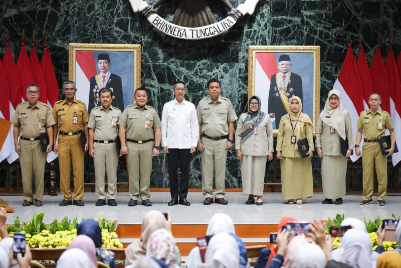 Penjabat (Pj) Gubernur DKI Jakarta, Heru Budi Hartono menyerahkah Surat Keputusan (SK) pensiun ASN Pemerintah Provinsi DKI Jakarta di Balai Agung, Balai Kota DKI Jakarta, Gambir, Jakarta Pusat, Senin (29/4). Sebanyak 188 ASN Pemprov DKI dari berbagai Satuan Kerja Pemerintah Daerah (SKPD) memasuki masa pensiun terhitung mulai tanggal 1 Mei 2024.