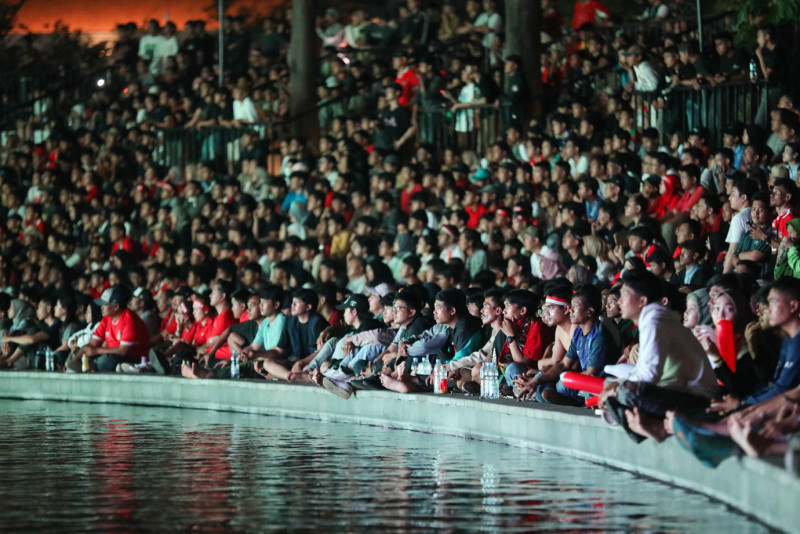 Pemerintah Provinsi (Pemprov) DKI Jakarta menggelar acara nonton bareng (nobar) semifinal Piala Asia U23 antara Indonesia vs Uzbekistan di Taman Lapangan Banteng, Sawah Besar, Jakarta Pusat, Senin (29/4). Ribuan warga antusias mengikuti acara nobar yang juga dihadiri oleh Penjabat (Pj) Gubernur DKI Jakarta, Heru Budi Hartono dan sejumlah pejabat di lingkungan Pemprov DKI.