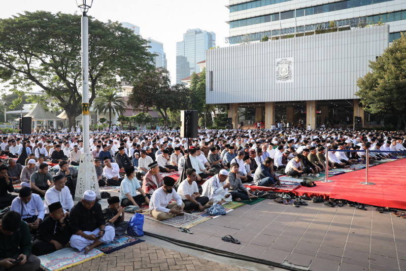 Pemerintah Provinsi (Pemprov) DKI Jakarta menggelar ibadah salat Idulfitri 1445 Hijriah di halaman Balai Kota, Gambir, Jakarta Pusat, Rabu (10/4). Ibadah salat Idulfitri dipimpin oleh imam Ustaz H Heri Kuswanto dan khotbah oleh KH Asrorun Ni\'am Sholeh serta dihadiri oleh Sekretaris Daerah Provinsi DKI Jakarta, Joko Agus Setyono. #lebaran2024