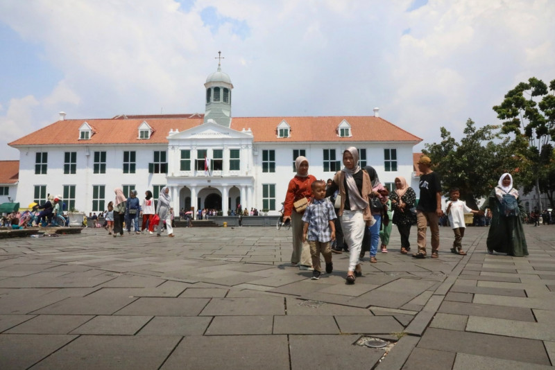 Kawasan Wisata Kota Tua Jakarta masih menjadi primadona destinasi wisata saat libur cuti bersama Lebaran 1445 Hijriah, Sabtu (13/4). Tercatat hingga pukul 12.00.WIB sebanyak 15.785 pengunjung berwisata di Kawasan Kota Tua Jakarta. #lebaran2024