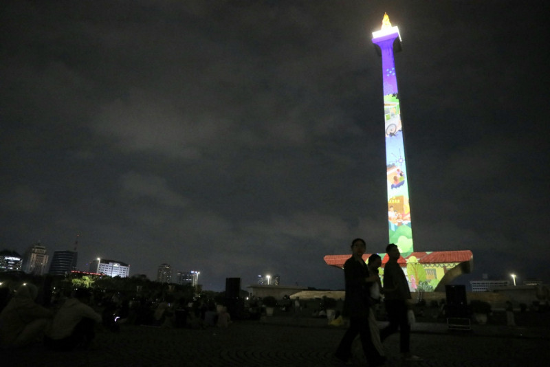 Ribuan warga mengunjungi kawasan Monumen Nasional (Monas), Gambir, Jakarta Pusat, Jumat (12/4). Dalam kegiatan Monas Week 2024 ini menyajikan berbagai pertunjukkan seperti video mapping dan Air Mancur Pesona Monas yang digelar dari 11-14 April 2024. #lebaran2024