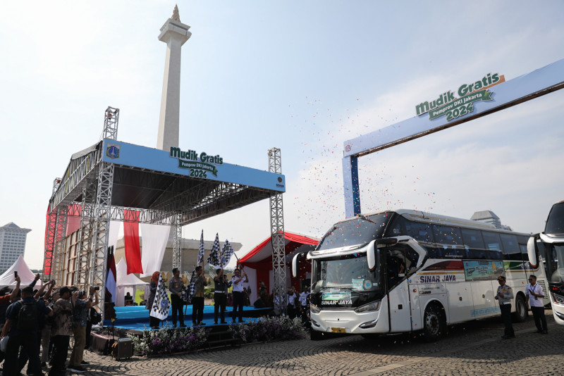 Sekretaris Daerah (Sekda) DKI Jakarta, Joko Agus Setyono melepas keberangkatan Mudik Gratis Pemprov DKI 2024 di Silang Barat Monumen Nasional (Monas), Gambir, Jakarta Pusat, Kamis (4/4). Sebanyak 279 bus yang mengangkut 12.170 penumpang diberangkatkan menuju sejumlah daerah di Pulau Jawa dan Sumatera secara serentak. #ramadan2024