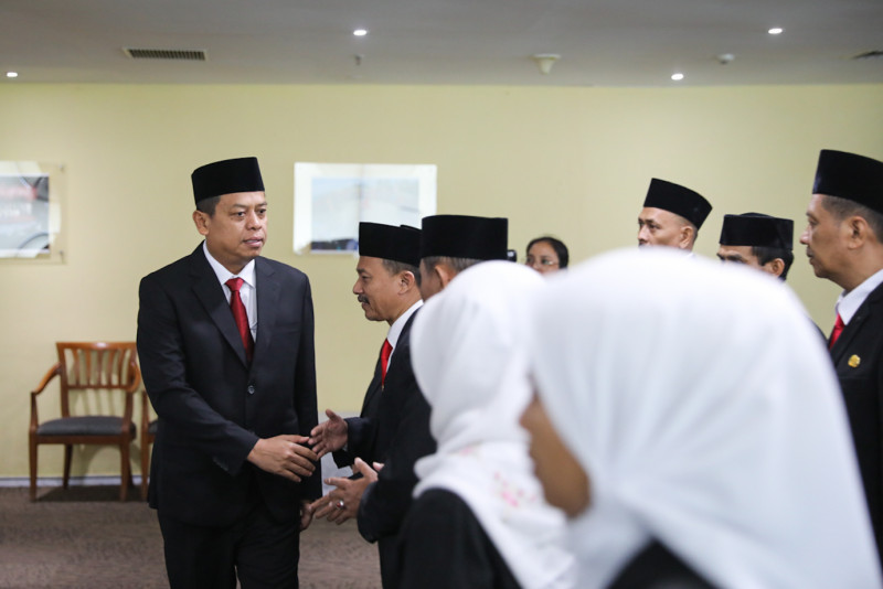 Sekretaris Daerah DKI Jakarta, Joko Agus Setyono melantik sejumlah pejabat administrator dan pejabat pengawas di Grha Ali Sadikin Balai Kota, Gambir, Jakarta Pusat, Kamis (4/4). Pelantikan tersebut ditujukan bagi 35 pejabat eselon III dan IV dengan rincian 21 pejabat promosi dan 14 pejabat mengalami mutasi.