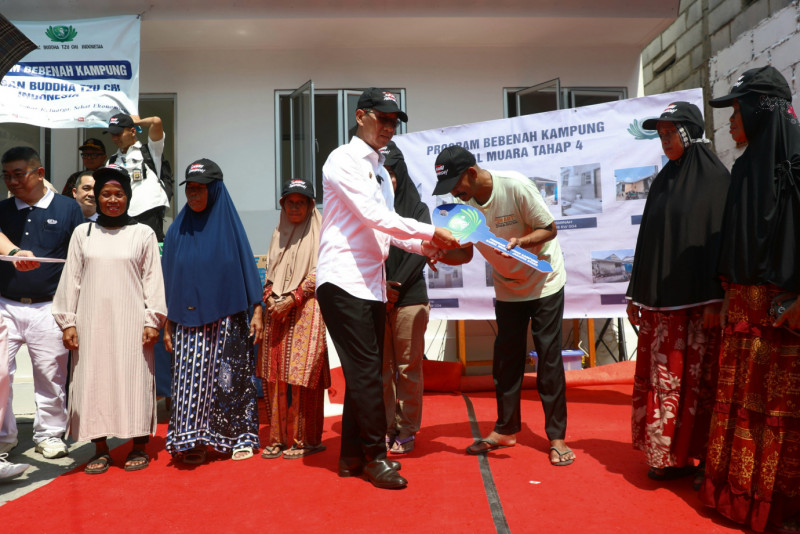 Penjabat (Pj) Gubernur DKI Jakarta, Heru Budi Hartono menyerahkan kunci rumah dari program Bebenah Kampung kepada warga penerima manfaat di RW 04, Kamal Muara, Penjaringan, Jakarta Utara, Kamis (28/3). Program ini terjalin berkat kerjasama antara Pemprov DKI Jakarta dan Yayasan Budha Tzu Chi yang telah merenovasi 35 unit.